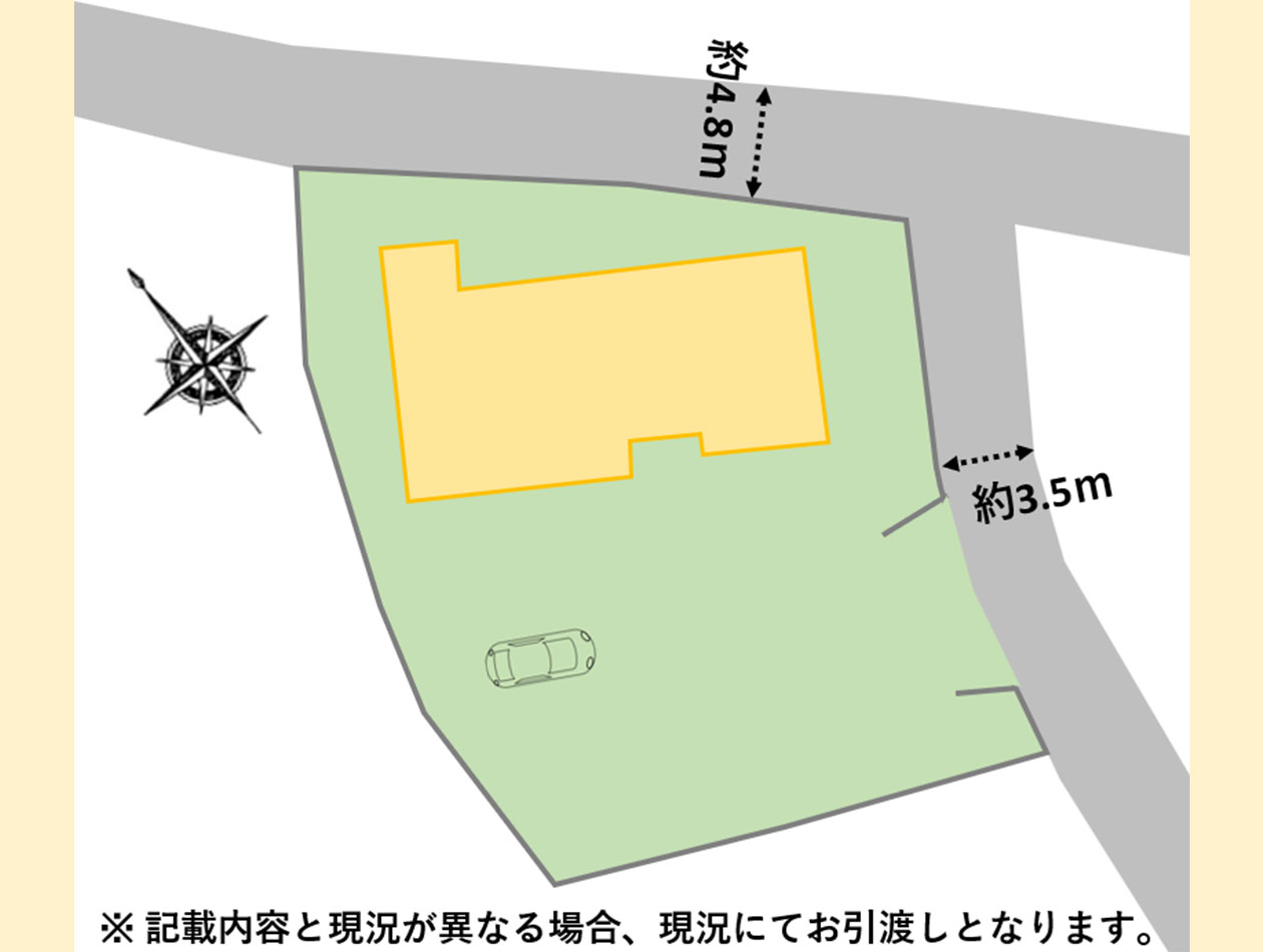 南東側 幅員約3.5mに約18.5m接道 北東側 幅員約4.8mに約20m接道 |