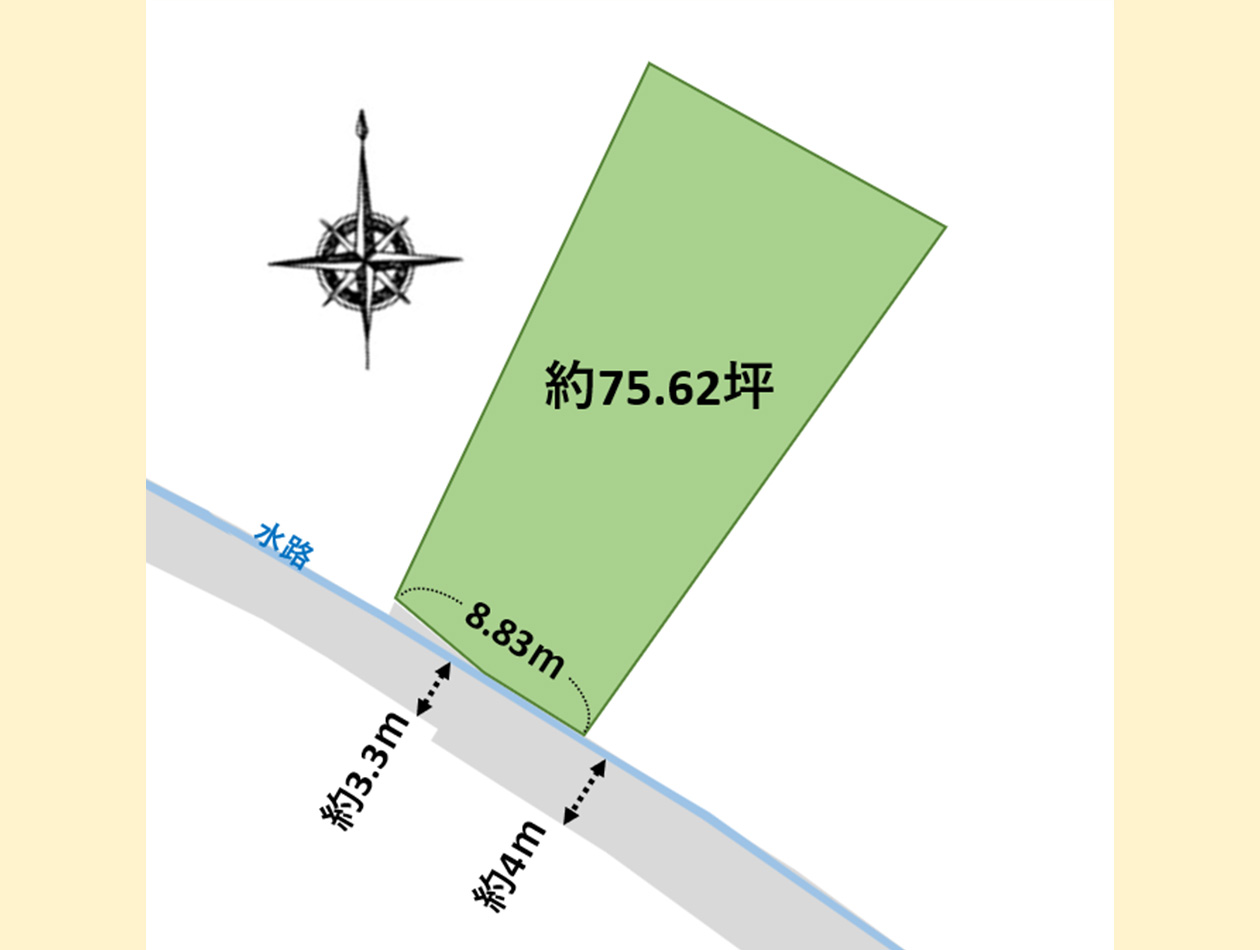 水路を挟んで敷地南西側に幅員3.3m(一部4m) 通行路橋設置要す |